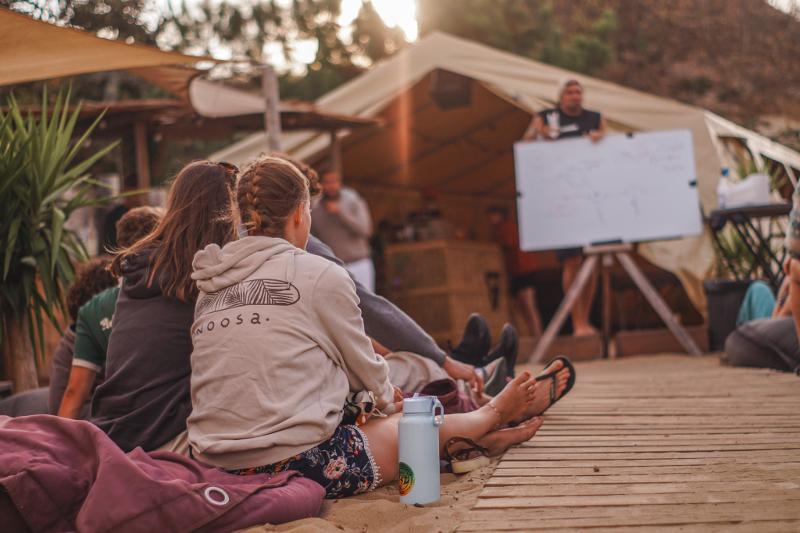 Durante la tua settimana al campo internazionale di surf riceverai una lezione completa di teoria del surf. Questa lezione interessante copre tutte le nozioni fondamentali su correnti, onde, maree e sicurezza generale. Verranno trattati tutti gli argomenti teorici per prepararti al meglio a una settimana tra oceano e surf, il tutto accompagnato da una birra fresca.